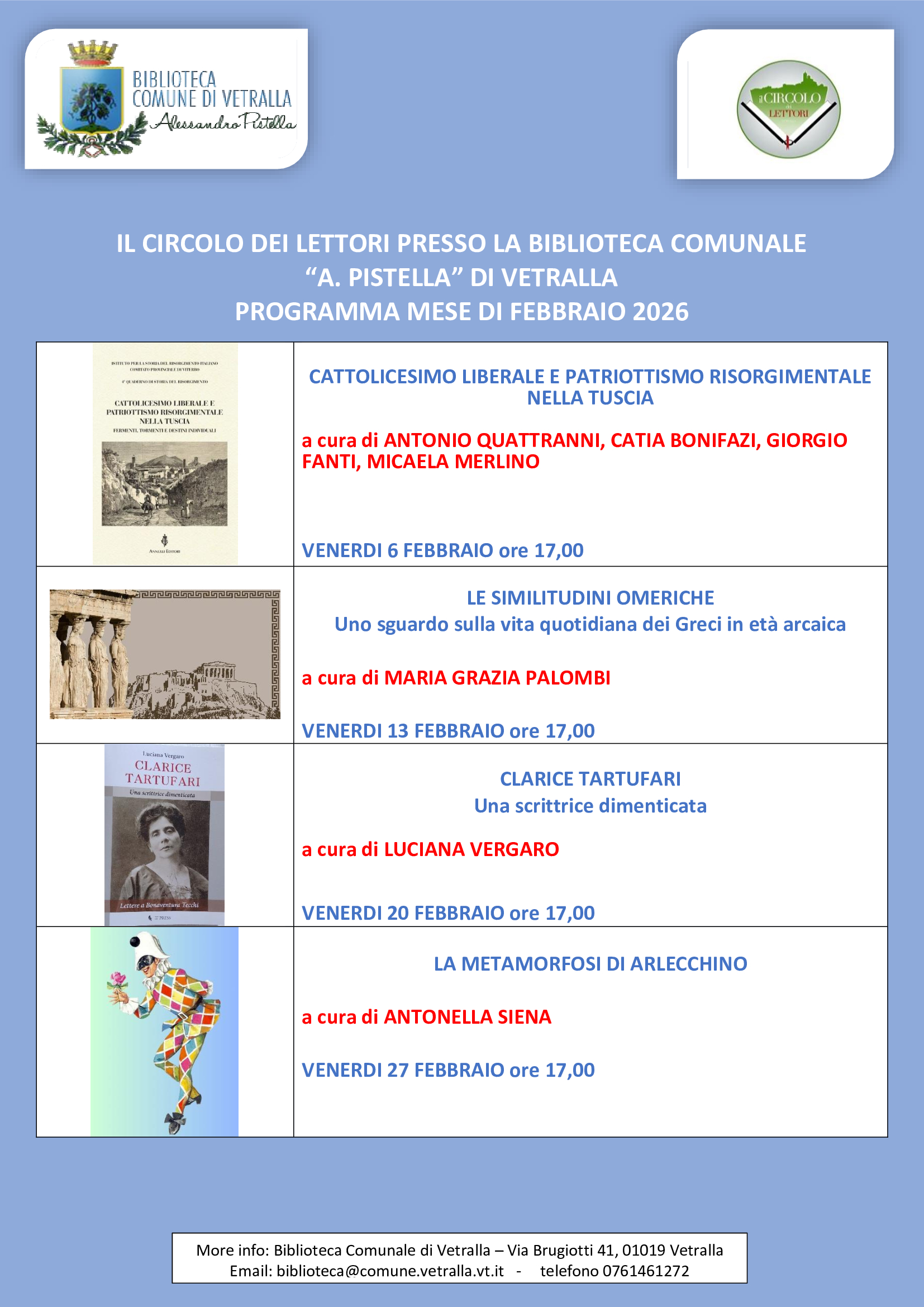 La Biblioteca Comunale di Vetralla comunica il programma del Circolo dei Lettori  per il mese di febbraio 2026